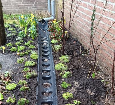 De HolieMolie is ontworpen om afgekoppeld regenwater bovengronds te transporteren, te bergen én te infiltreren met een overstort naar de openbare ruimte. De goot is eenvoudig te plaatsen en geeft direct resultaat. Het eerste gedeelte is een blinde transportgoot met een beginkap. De beginkap voorkomt kans op water tegen de gevel. De blinde goot voert het water af. De aansluitende infiltratiegoten hebben grote gaten (Ø 8 cm) die het regenwater laten infiltreren in de tuin. Het aflopende eindstuk sluit aan op de openbare ruimte. Bij hevige regenval stroomt het overtollige regenwater via dit eindstuk naar de straat. Dat komt indirect terecht in het (hemelwater)riool. Zo er is altijd een overstort.